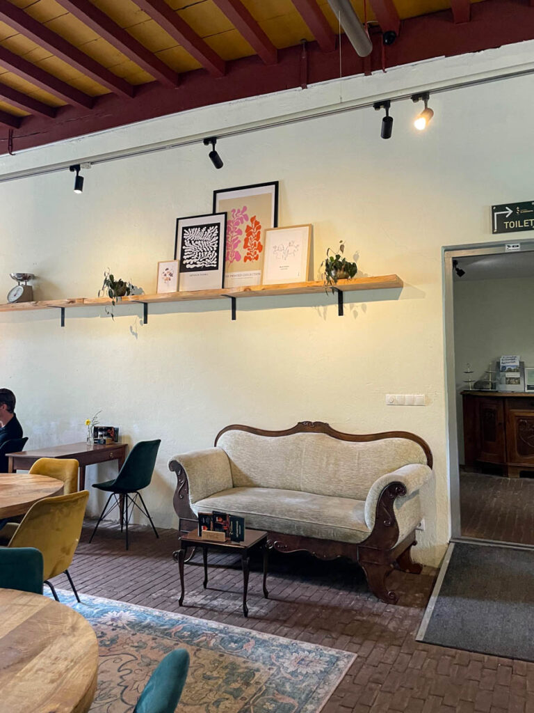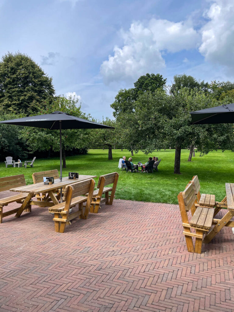 Echt een super tof plekje dit. Ze hadden hier een vreselijk toeristisch tentje van kunnen maken – want mensen komen toch wel – maar gelukkig hebben ze dat niet gedaan. Buiten staan fijne stoelen en grote picknickbanken, dus hier is het ultiem genieten als de zon schijnt. Maar ook op donkere, koude dagen is er geen excuus om weg te blijven: binnen is het minstens zo gezellig. Je kunt er lekker lunchen, taartjes eten of borrelen.